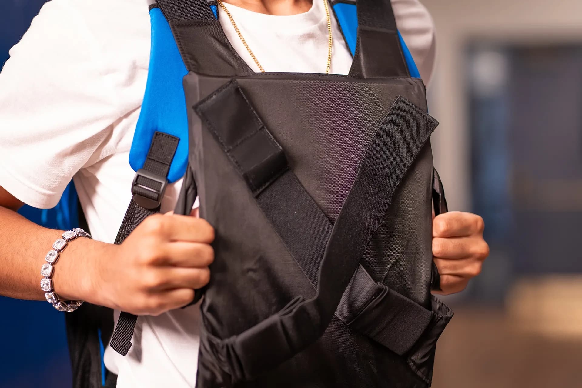 Hold onto the side handles to steady the vest. This ensures the plate stays centered, providing consistent protection as you move or take cover.
